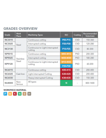 Cette référence permet une large plage de vitesse de coupe, ce qui devient un atout intéressant sur les tours traditionnels ne pouvant pas atteindre les hautes vitesses recommandées sur d'autres nuances spécifiques.
